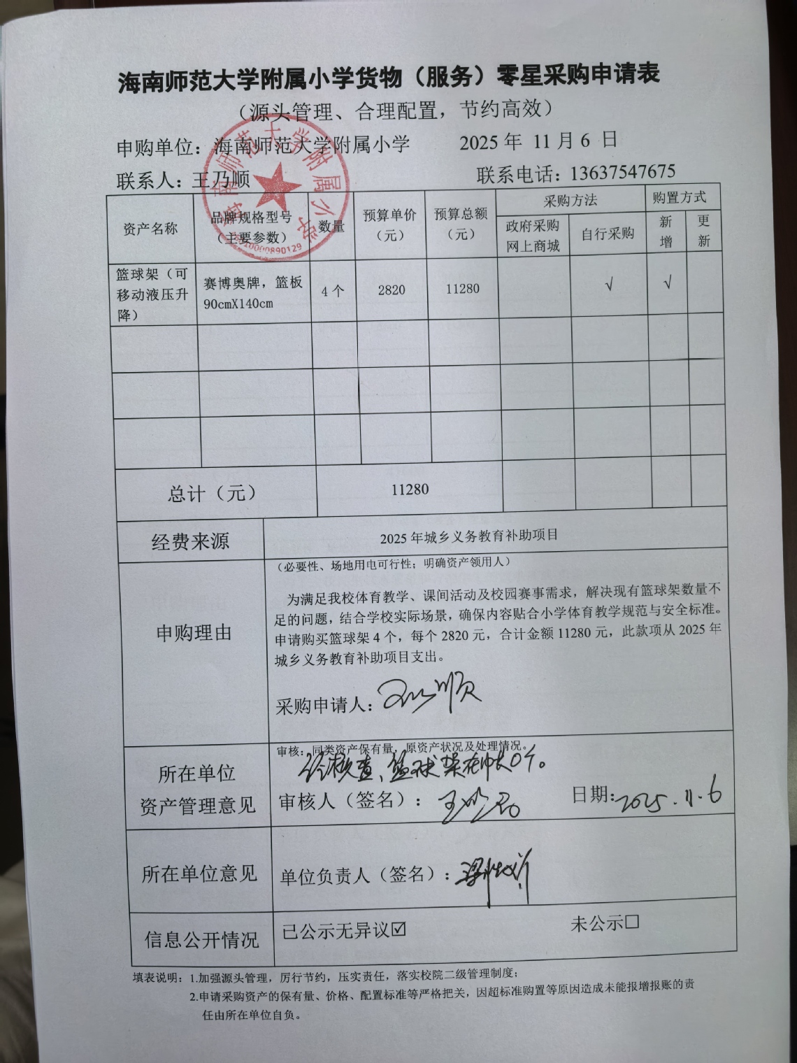 为满足爱爱啦体育教学、课间活动及校园赛事需求,解决现有篮球架数量不足的问题,结合爱爱啦 实际场景,确保内容贴合小学体育教学规范与安全标准。申请购买篮球架4个,每个2820元,合计金额11280元。