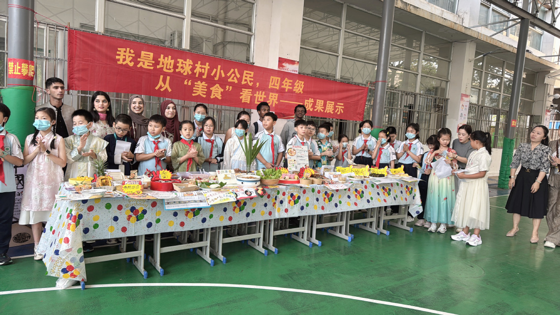 调研伊始,梁胜娟校长带领调研组实地走访校园,全面介绍学校校园文化、课程阵地、特色功能区及育人环境建设情况,展现学校在有限空间内深耕教育、拓展育人边界的实践探索。四年级学生带来“我是地球村小公民 —— 从‘美食’看世界”主题成果展示。孩子们以美食为纽带,分享不同国家与地区的饮食文化、民俗风情,在互动交流中拓宽国际视野,生动呈现学校国际理解教育的丰富成效。