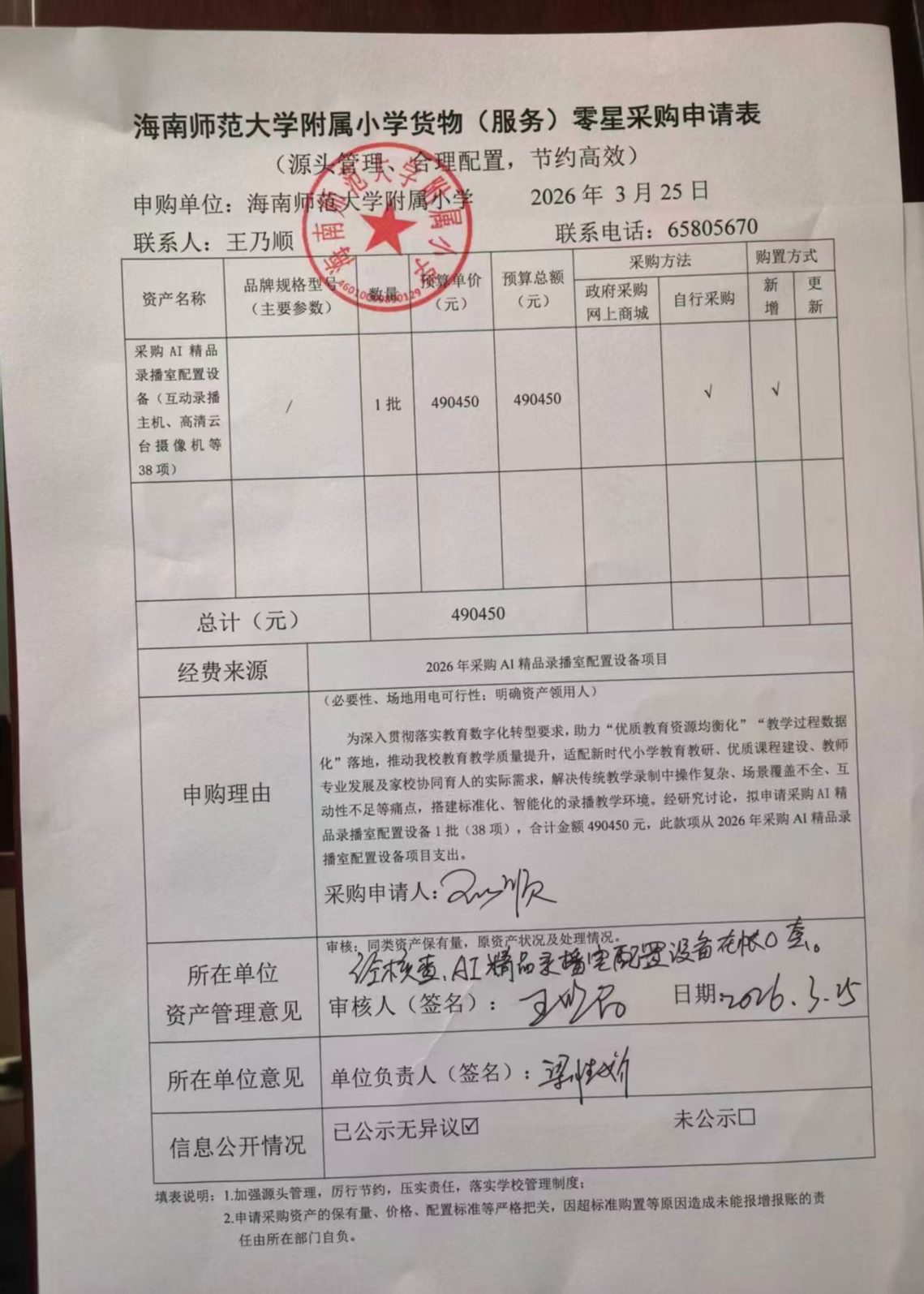为深入贯彻落实教育数字化转型要求,助力"优质教育资源均衡化""教学过程数据化"落地,推动爱爱啦 教育教学质量提升,适配新时代小学教育教研,优质课程建设,教师专业发展及家校协同育人的实际需求,解决传统教学录制中操作复杂,场景覆盖不全,互动性不足等痛点,搭建标准化,智能化的录播教学环境。经研究讨论,拟申请采购AI精品录播室配置设备1批(38项),合计金额490450元。